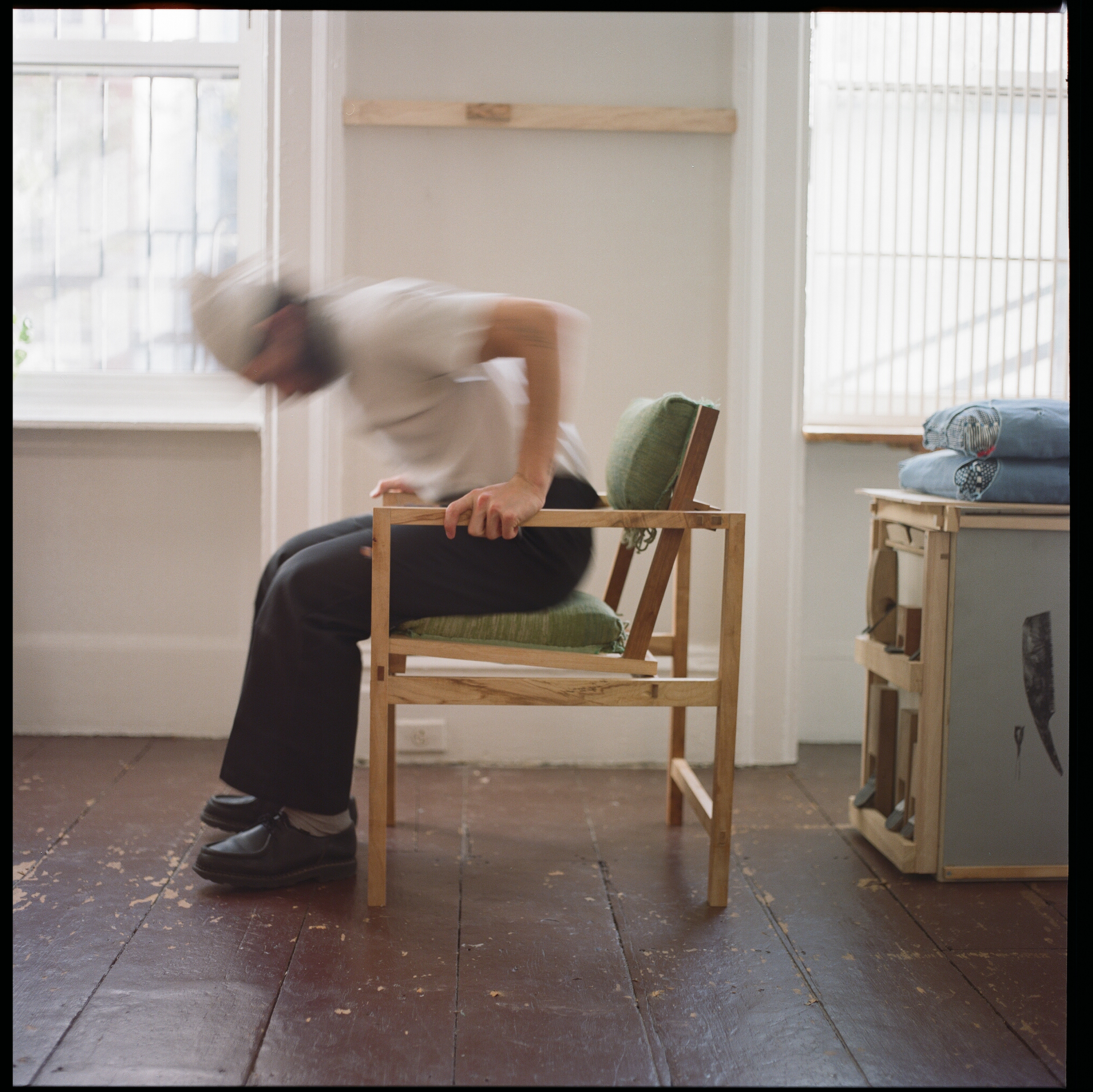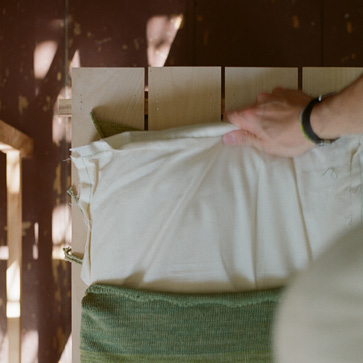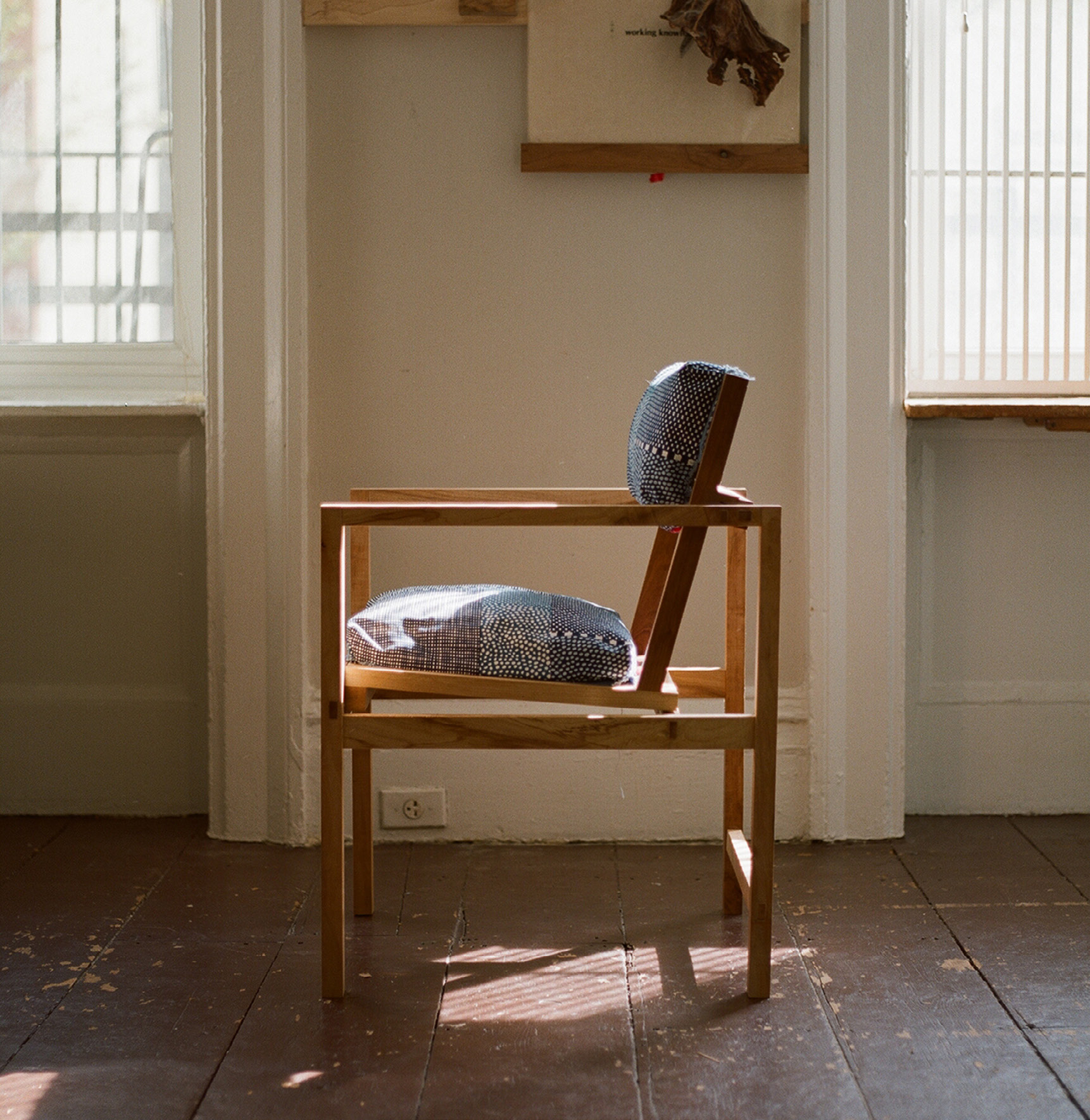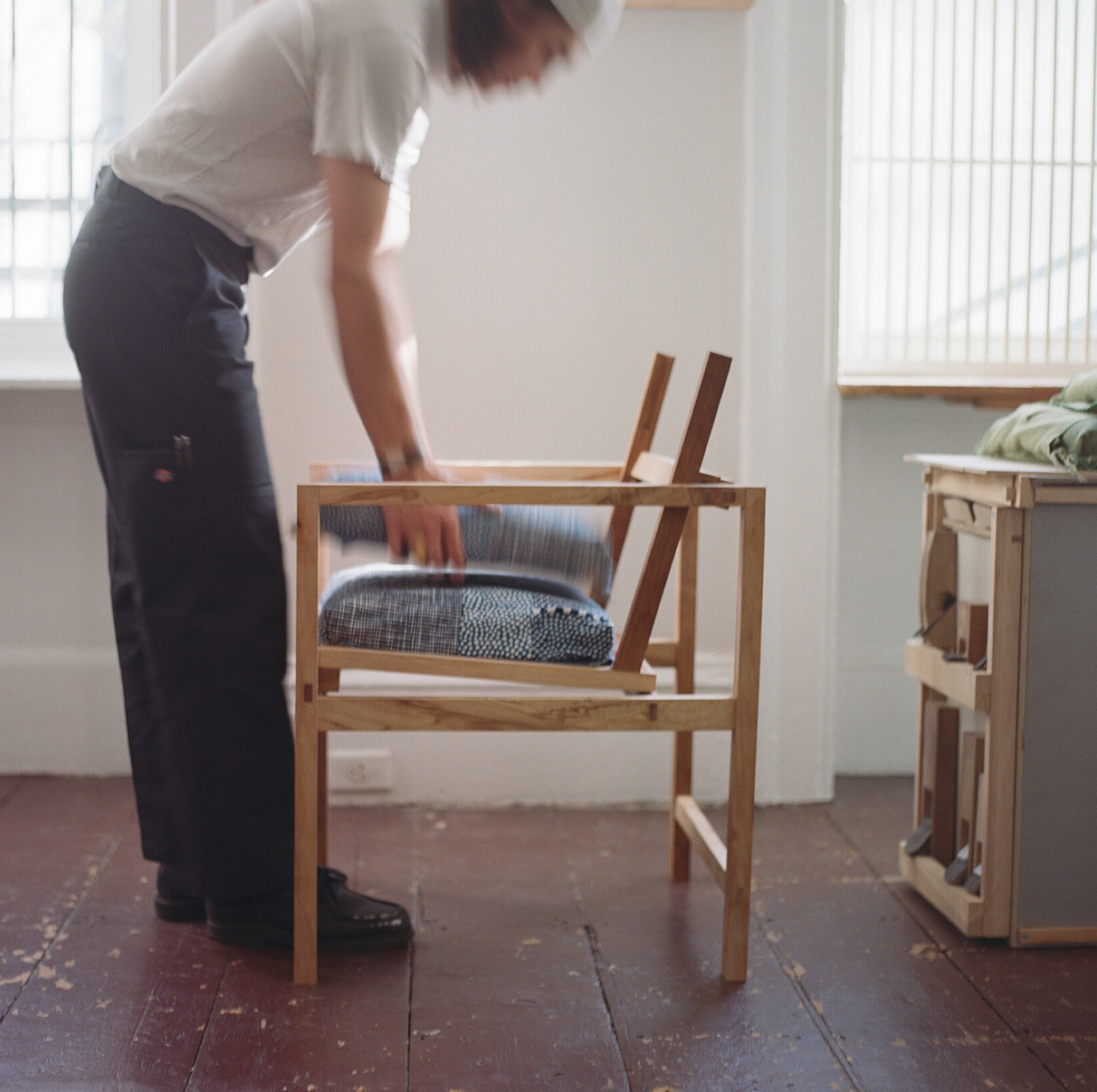 The chair’s material composition is maple offcuts from an Amish sawmill in Pennsylvania. Handmade knit upholstery by Emma Cali and hand-woven textile from Sou Sou, Japan. The fill of the inner cushion is made of quilted Greige good fabric, milkweed floss and post-consumer FLWRDWN TM.