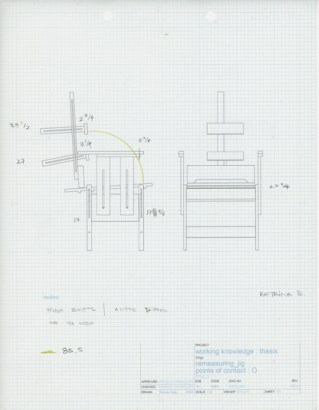 The qualitative and quantative research that comes ou of this study will dictate a formulated understadning of what a seat mean to the people that have been measured, demonstrating the necessary step in telling the story of making an objects.